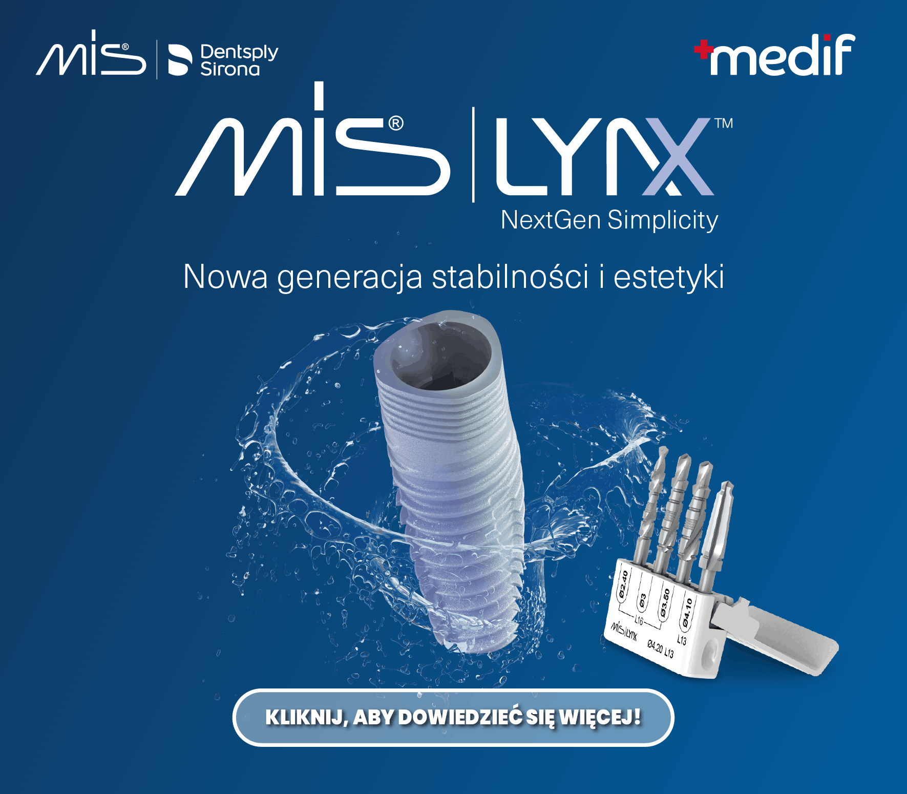 MIS LYNX to generacja implantów klasy Value Plus o „mokrej” powierzchni MIS CLEAR dająca przewagę biologiczną i wpływa na szybszą osteointegrację. Inspiracja systemami V3 i C1 XD, ale z nową geometrią gwarantującą lepszą stabilność pierwotną w trudnych przypadkach. Zapewnia kompatybilność z cyfrowym protokołem protetycznym MIS conical connection i pełna integracja z workflow CAD/CAM. Impllant jest idealny do implantacji natychmiastowych – stabilność i bezpieczeństwo tkanek